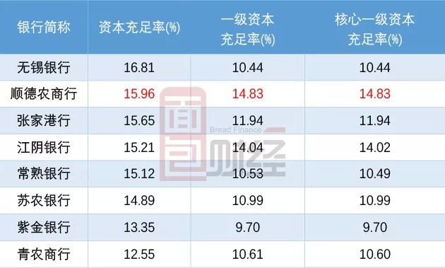 截止2018年末,与其他7家已上市农商行相比,顺德农商行除资本充足率排在第二名,其一级资本充足率及核心一级资本充足率均排在第一名。