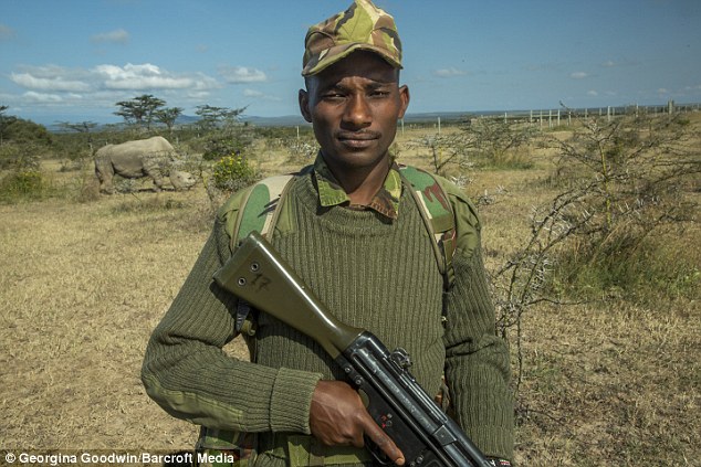 守卫John Mugo扛着G3A3突击步枪在围栏里保护着苏丹。他说:“苏丹很特殊,因为它是世界上最后一头雄性北方白犀牛,我们的守卫一天24小时守护着它防止它被偷袭。”为了全方位保护苏丹的安全,守卫们早上6点和下午6点进行轮班守护。