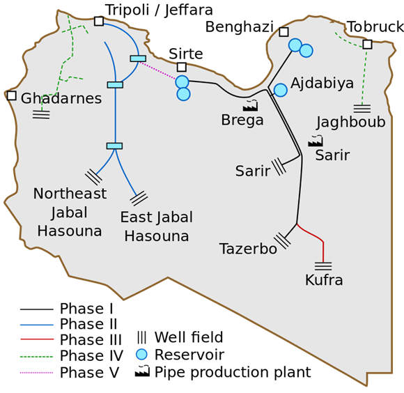 2011年7月,北大西洋公约组织(简称“北约”)轰炸了布雷加附近的大人工河供水管道,还包括一家生产管道的工厂。北约声称该工厂被用作“军用仓库”,而且发射火箭。这一攻击直接破坏了依赖于管道供水的70%人口的用水。