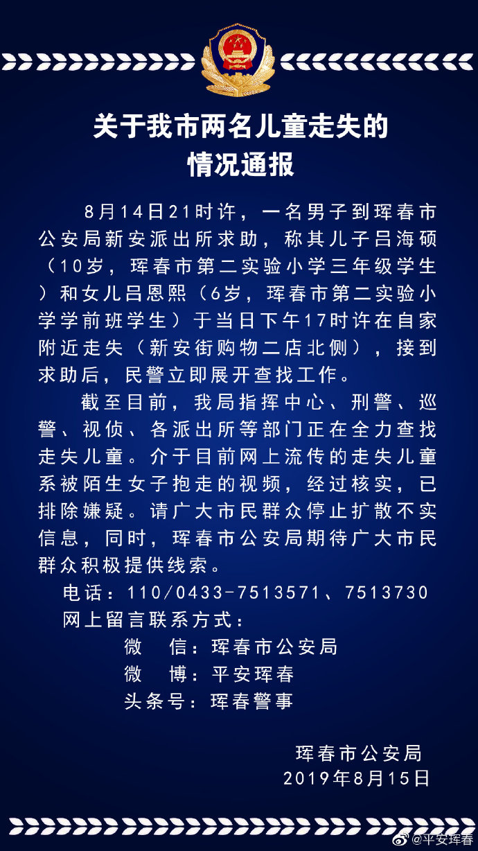 吉林省珲春市公安局通报,8月14日21时许,一名男子到派出所求助,称其儿子和女儿于当日下午17时许在自家附近走失,接到求助后,民警立即展开查找工作。