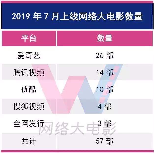 7月份全平台上线网络大电影共57部,跟2、3月份处于同一水平。其中,爱奇艺上线26部,腾讯视频上线14部,优酷10部,搜狐视频4部,全网发行3部。