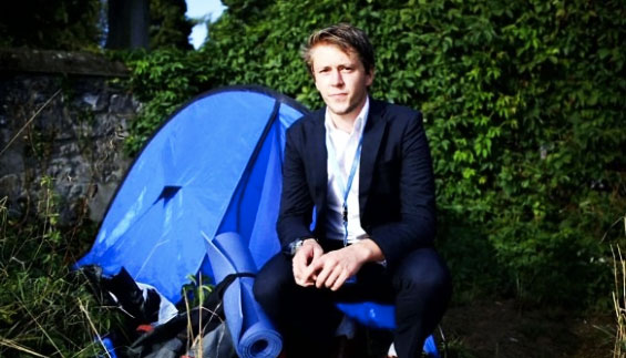 今年22岁的海德(David Hyde)申请到了联合国的实习生,从新西兰飞了11,000英里来到瑞士日内瓦,却因无法负担当地的住宿费而只能睡帐篷。这名国际关系毕业生和他帐篷的一张照片也开始在社交媒体上疯传开来。照片中,他身着一尘不染的西装,脖子上挂着联合国的工作牌,半蹲在一个蓝色小帐篷旁,边上还放着一卷泡沫垫子。