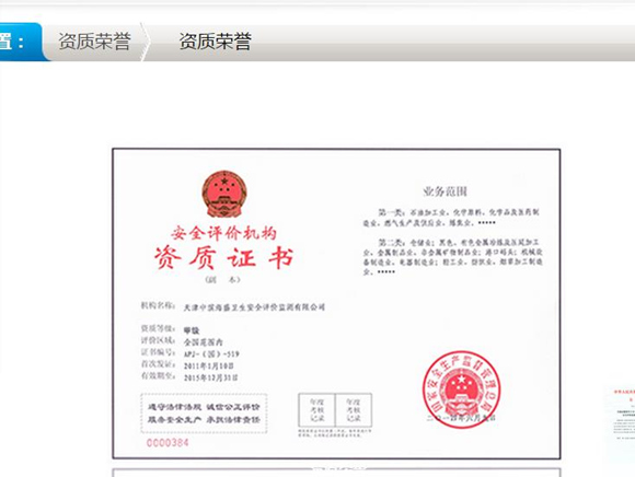 此外,与被关闭前的网站有所不同的是,重新开启的网站只有“安全评价”一栏为有效信息,并且只有这一份新增加的瑞海国际资料,其他原有的大部分资料皆被删除,包括给其他公司作安全评价报告的约20份项目公示。此外,官网还专门增加了“资质荣誉”一栏,将自己的资质证书放在首页。
