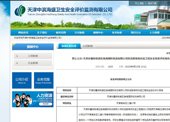面对诸多质疑,给瑞海国际做安全评价的第三方安全评价公司天津中滨海盛在8月19日至20日期间重新开启网站,并上传了一份有关瑞海国际的安全评价报告。界面新闻记者发现,这份报告显示了瑞海国际在试运营期间即涉嫌超标违规、早被定性为构成危险货物一级重大危险源等至关重要的信息。