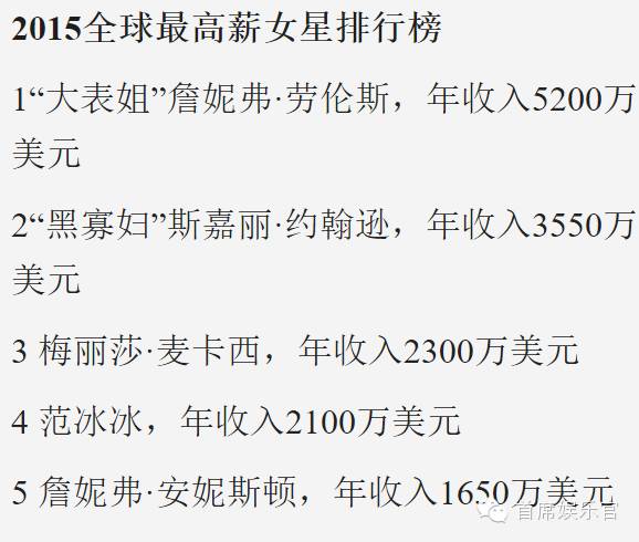 然而虐完单身狗还不算,号称一口价6000万吓退节目组的范爷更是碾压了无数花痴女神的穷屌丝。今天,美国《福布斯》杂志公布了“全球最高薪女星排行榜”,而唯一进榜的亚洲女星正是女神范冰冰。
