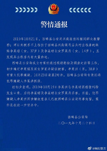 据云南省文山西畴县公安局通报,2019年10月21日,西畴县公安局兴街派出所接到群众报警称:两日来联系不上租住于西畴县兴街镇马店头村出租房的妹妹李某琼(女,37岁)及李某琼长女罗某丹(女,14岁),且发现其出租房内有大量血迹。
