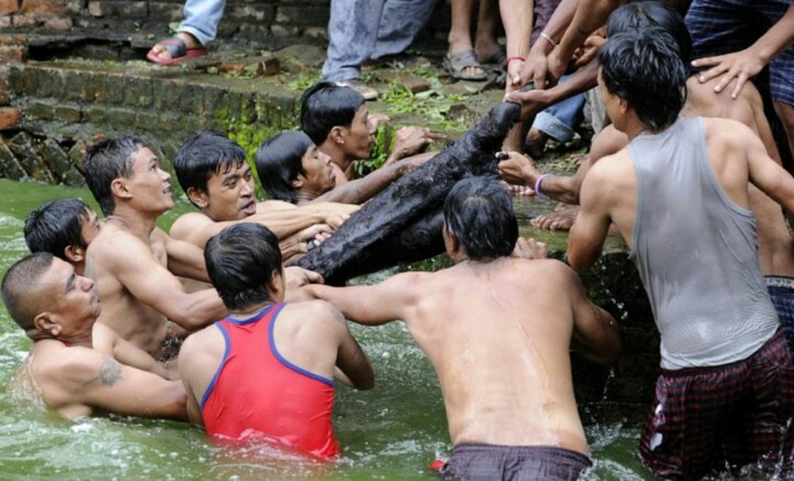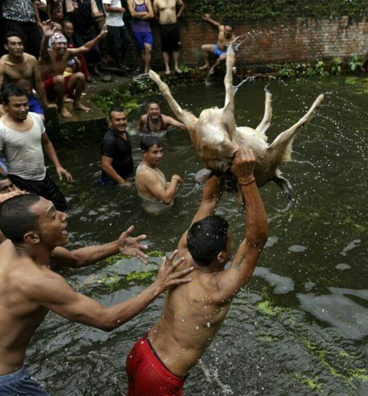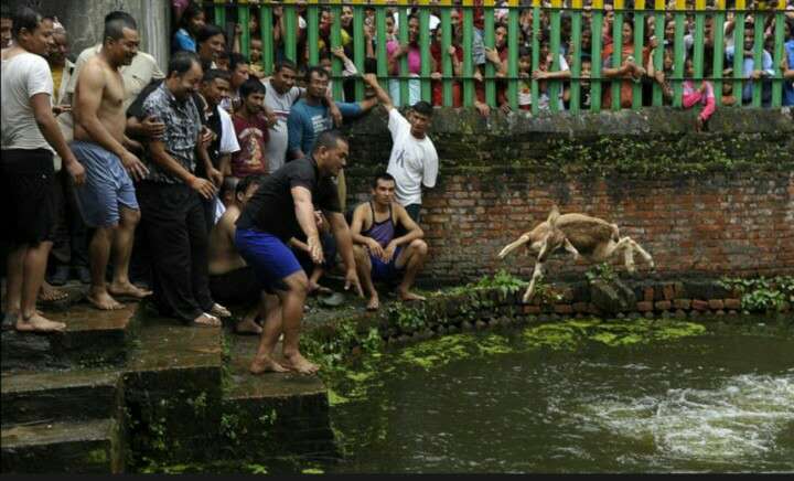一只五个月大的山羊被丢进村子中央靠近Rudrayani庙的Deu圣池里。一群男人随即跳入池塘中,试图用双手和牙齿将山羊撕碎。