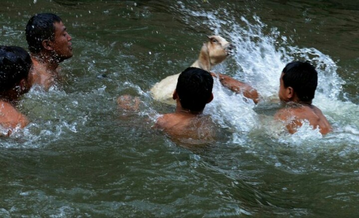 这个节日可以追溯到12世纪,当时村庄里的一个小孩溺水身亡,当地人为了抚慰神灵,将一只活山羊溺死在水中。