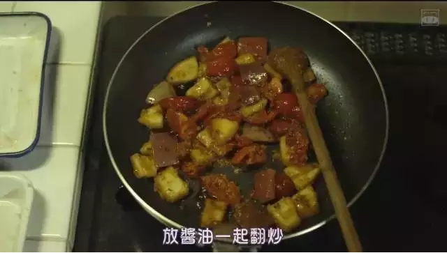 ◆ 果皮呢,切一口大小,热油加两勺小茴香、蒜末、葱末、咖喱粉、番茄块(大概小番茄切半),放入果皮,放入酱油翻炒。算是小菜,下酒菜;