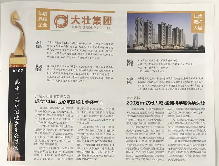 11月29日,大壮集团斩获由南方都市报社主办的 2019(第十一届)中国地产年会重量级奖项——“年度品牌企业大奖”、大壮名城斩获“年度标杆人居大奖”。