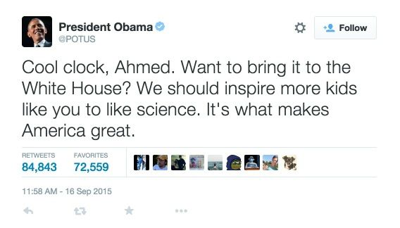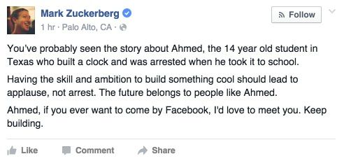 “你们或许都听说了14岁的Ahmed的故事,这名学生带着自制的时钟去了学校,但却因此被捕。拥有这种打造酷炫物品的技能和雄心,理应迎来掌声,而不是被逮捕。未来属于像Ahmed这样的人们。Ahmed,如果你愿意来Facebook的话,我会乐于和你见面的。别放弃你的手工。”