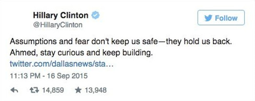 “假设和恐惧不会让我们安全,只会让我们倒退。Ahmed,保持你的好奇心并继续创造吧。”