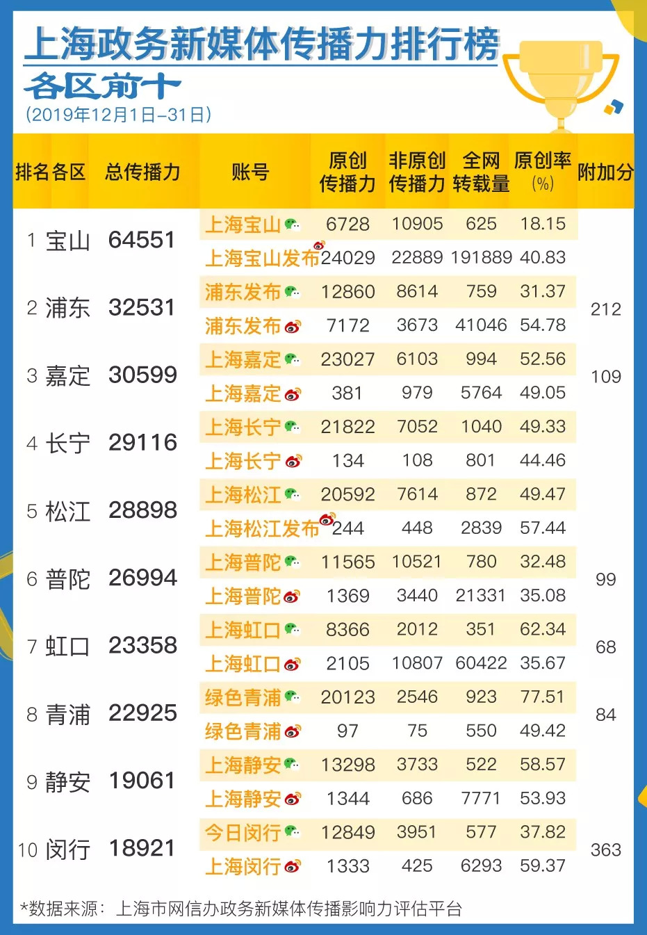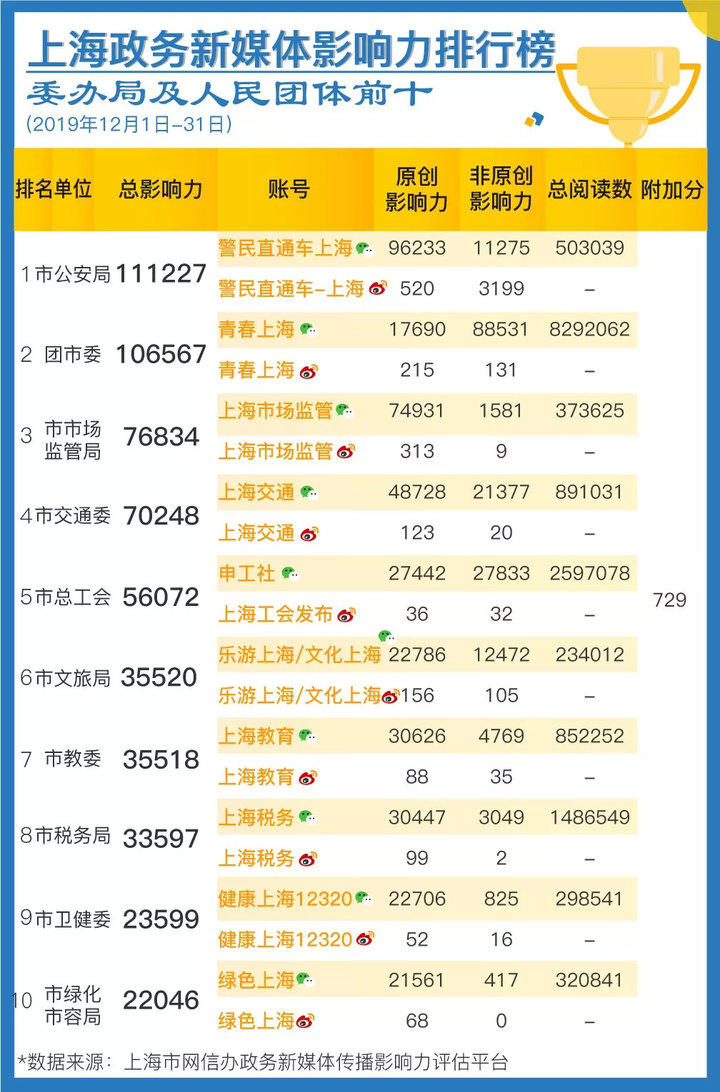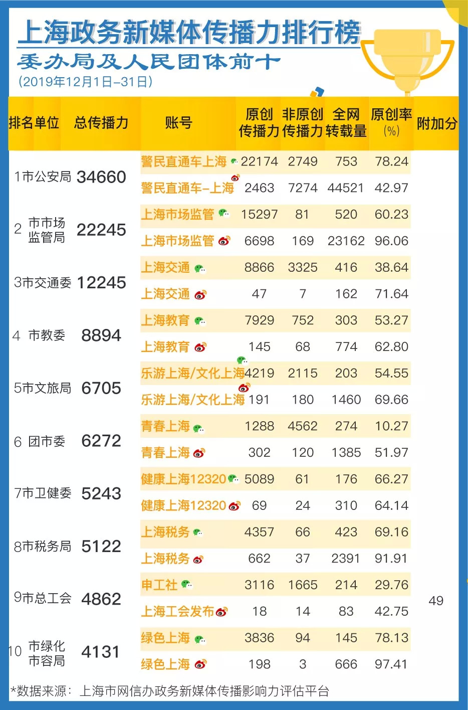 榜单由上海市委网信办与上海市政府新闻办公室联合发布。数据来源于上海市委网信办自主研发的“政务新媒体传播影响力评估平台”,目前该平台覆盖全网各渠道,纳入了225个新闻客户端、246家新闻网站、1200万微信公众号、3亿多微博账号的数据。