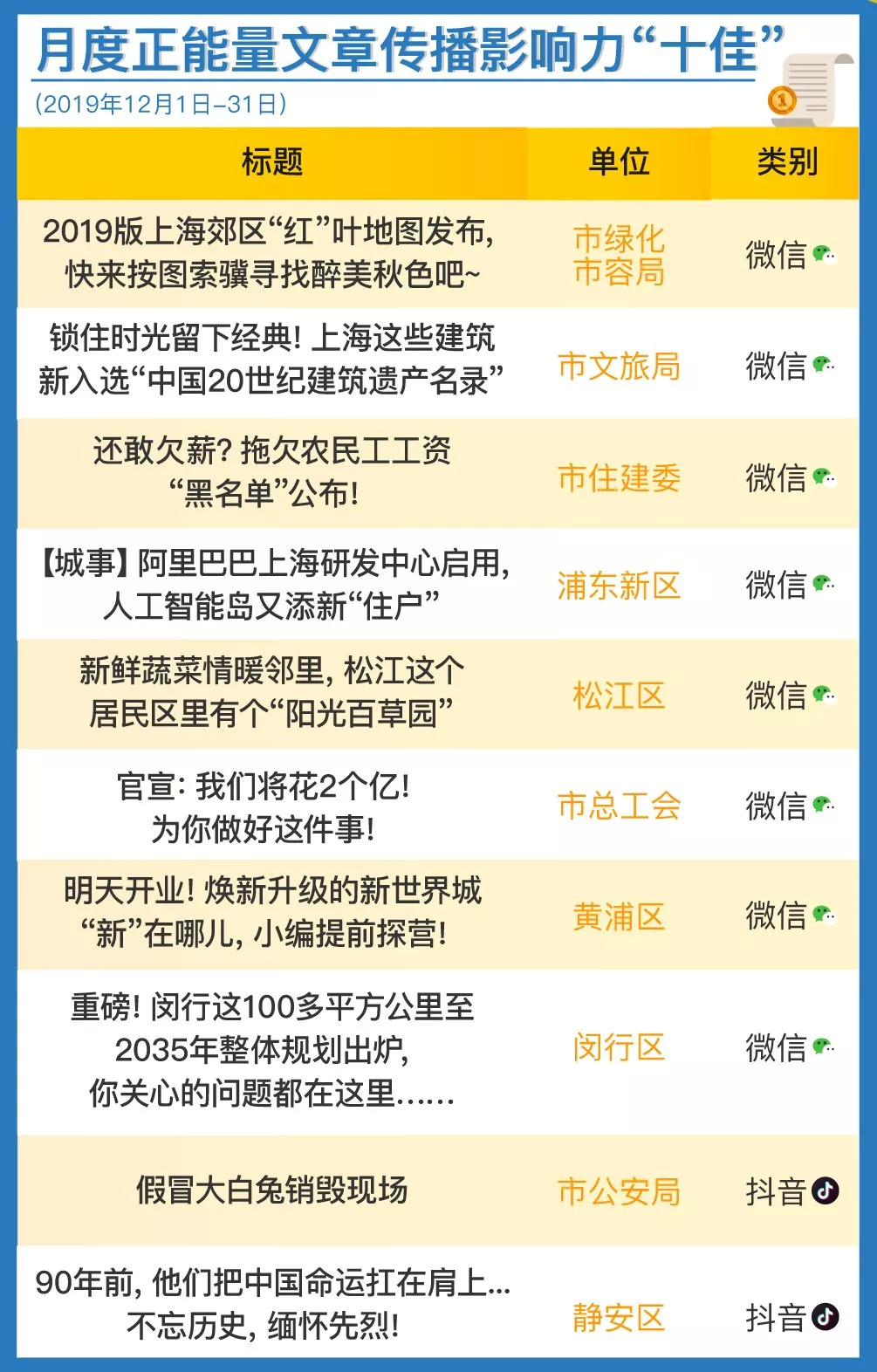 本期公布的文章榜中,微信占8篇,抖音占2篇。微信稿件中,市绿化市容局精心整理”红叶地图”,贴心又实用;市住建委公布拖欠农民工工资的“黑名单”,较好履行监管责任,有效促进自身工作;黄浦详尽报道本区域商业中心开业消息,及时提供便民信息;闵行则重点推送重要政策文件信息,权威解读2035年整体规划方案。相关稿件引起公众关注,均取得较好传播效果。两个上榜抖音小视频各有特色:市公安局销毁假冒大白兔奶糖现场的实况小视频,阅读量1468.3万,点赞量超过18.5万次,受到网友支持;静安区的抖音则通过历史影像资料与一大会址现场的画面对比,勾起了网友的爱国情怀,点赞量也超过2.2万次。