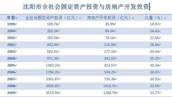 辽宁社科院经济所前所长陈萍对1999年至2009年间沈阳市房地产数据进行分析。数据显示,2004年至2009年间,无论是商品房价格还是住宅价格,都是以两位数的年均增长率上升。从增长速度看,1999年至2009年,全社会固定资产投资年均增长33.92%,同期房地产投资年均增长41.87%,房地产开发投资的年增长速度明显超过固定资产投资的增速,从而使房地产开发投资在固定资产投资中所占的比重提高至1/3。