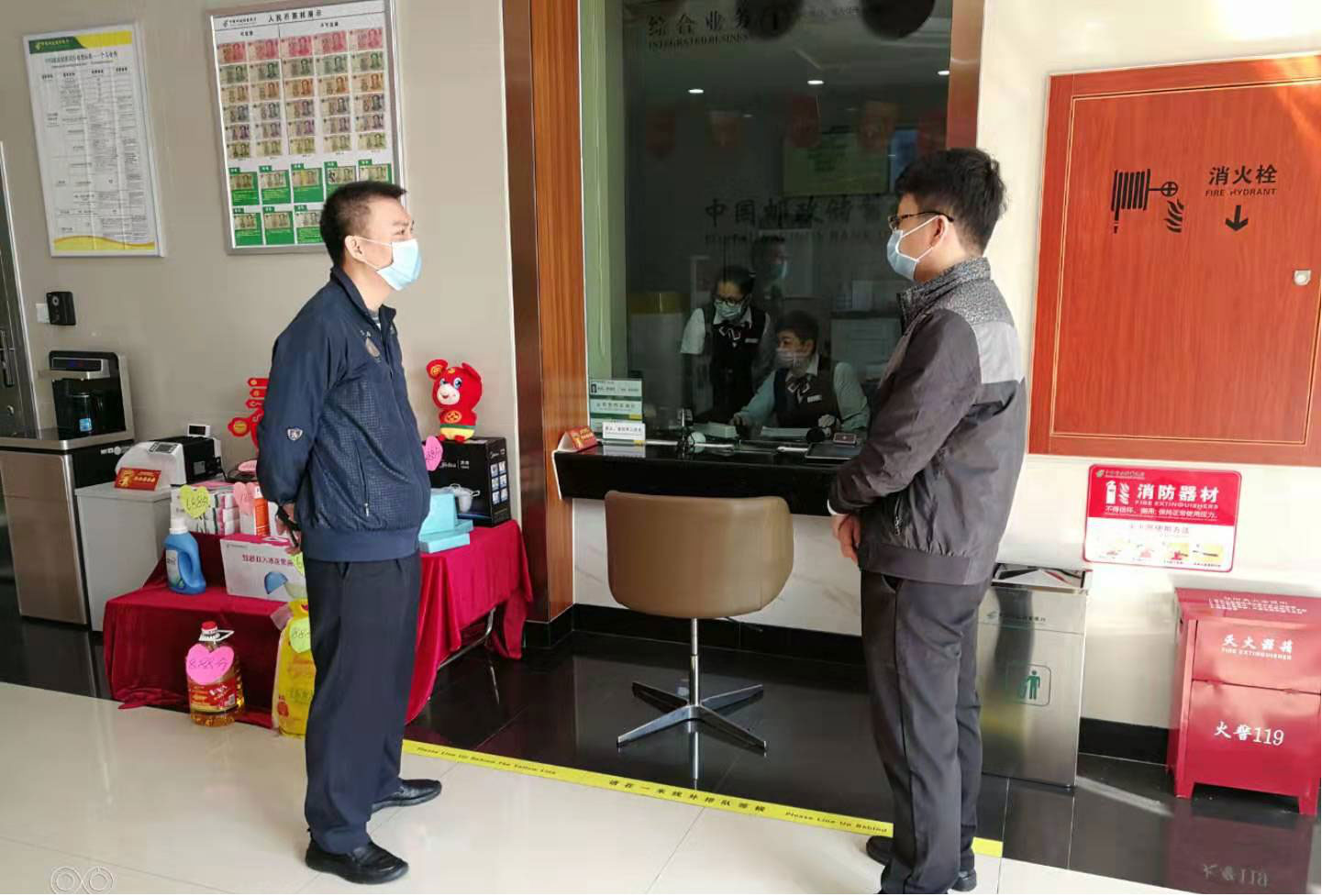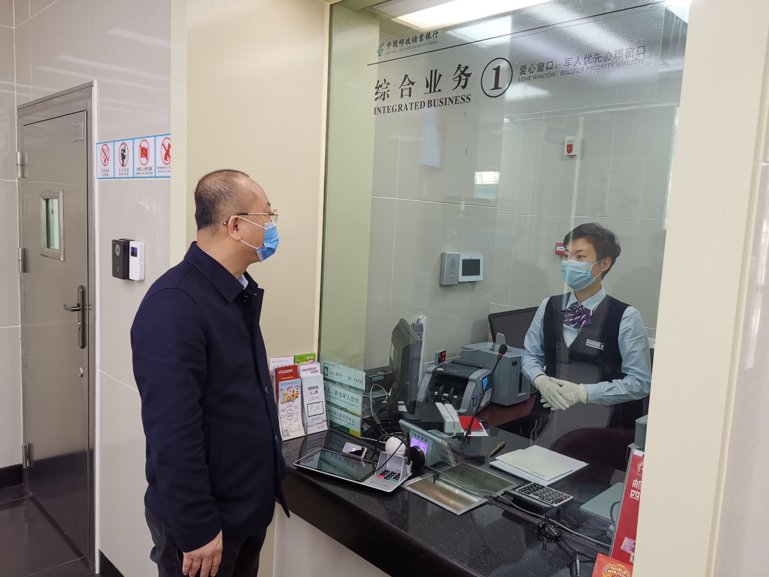 邮储银行海口市分行领导班子坚持深入防控疫情第一线,靠前指挥,五位行领导分别前往营业网点慰问坚守岗位的员工,详细了解金融服务情况及疫情防控措施的具体落实情况,督导营业人员务必戴口罩,量体温,勤洗手,做好机具设备消毒等防护工作。梁丰行长提醒大家除了注意自身和网点的防护,还要引导客户做好防护工作。