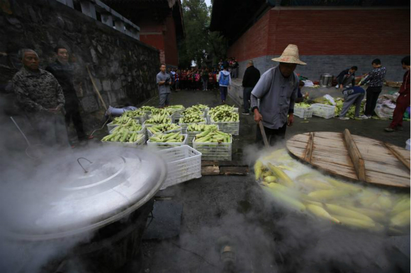 10月7日,少林寺里的游客品尝到了免费的煮玉米,这些玉米是少林寺禅耕农场刚收的,在寺院里现煮现送。