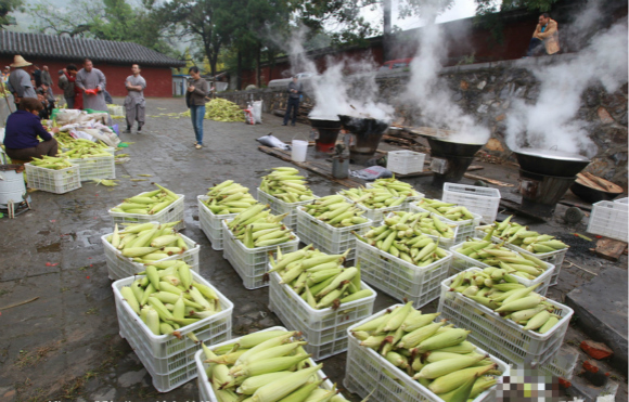 据悉,日前少林寺禅耕农场今年秋天收获的第一茬鲜玉米有3000多斤鲜玉米,皆煮熟回馈给游客。