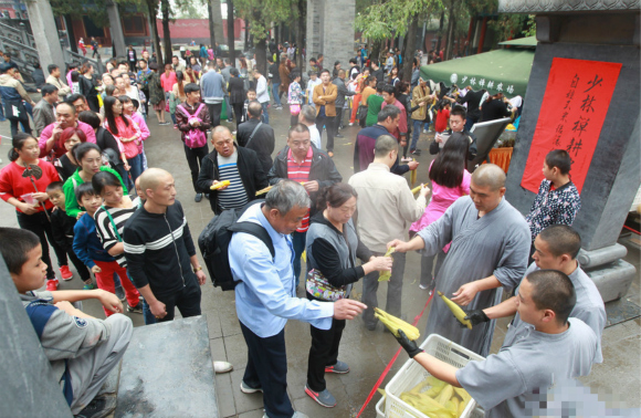 10月7日,少林寺里的游客品尝到了免费的煮玉米,这些玉米是少林寺禅耕农场今年秋天收获的第一茬鲜玉米,在寺院里现煮现送。第一锅煮好后,还没等排队的警戒线拉起来,煮玉米就被哄抢一空。