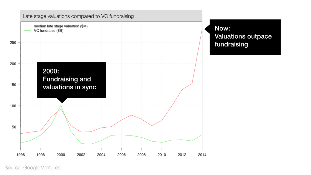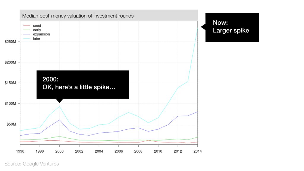 根据Gooogle Venture的数据,与15年前的2000年相比,创业项目的种子轮估值基本持平,但后期的估值达到了一个新的高峰,接近2000年时的3倍。