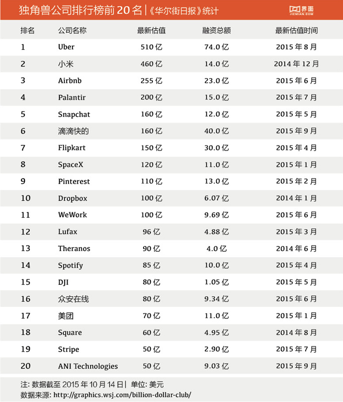 独角兽原本是指难得一见的“神兽”,但现在遍地都是。在过去长达10年的时间里,只有不到40家非上市公司达到了这一门槛。而根据《华尔街日报》最新的统计数据,独角兽公司的数目现在已经达到了123家(截至10月14日),估值之和达到4680亿美元。