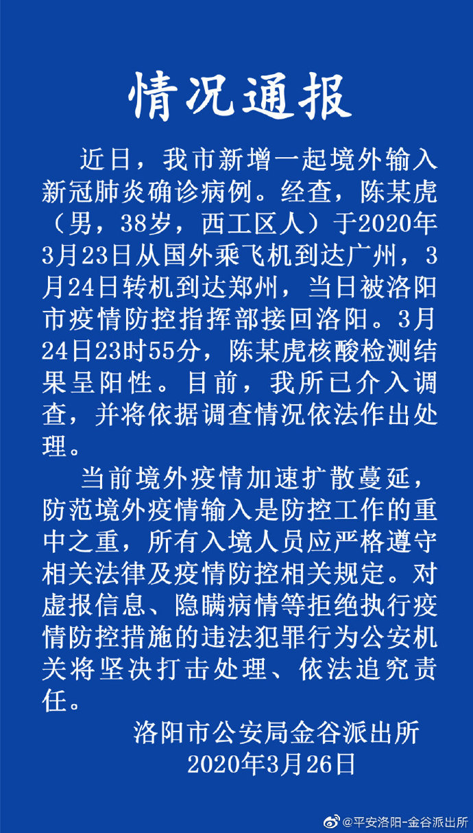 据河南省洛阳市公安局金谷派出所官方微博通报,近日,洛阳市新增一起境外输入新冠肺炎确诊病例。经查,陈某虎(男,38岁,西工区人)于2020年3月23日从国外乘飞机到达广州,3月24日转机到达郑州,当日被洛阳市疫情防控指挥部接回洛阳。3月24日23时55分,陈某虎核酸检测结果呈阳性。目前,我所已介入调查,并将依据调查情况依法作出处理。