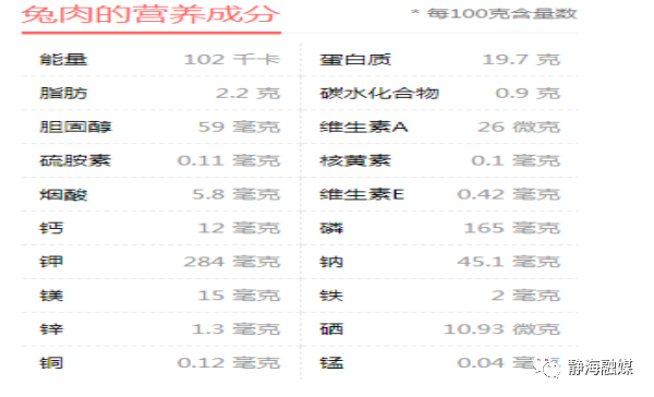 作为一种高蛋白、高磷脂、低脂肪、低胆固醇的食物,兔肉中有含量较高的卵磷脂以及丰富维生素和钙质,不仅有较高的营养价值,也对健脑益智等都有益处。