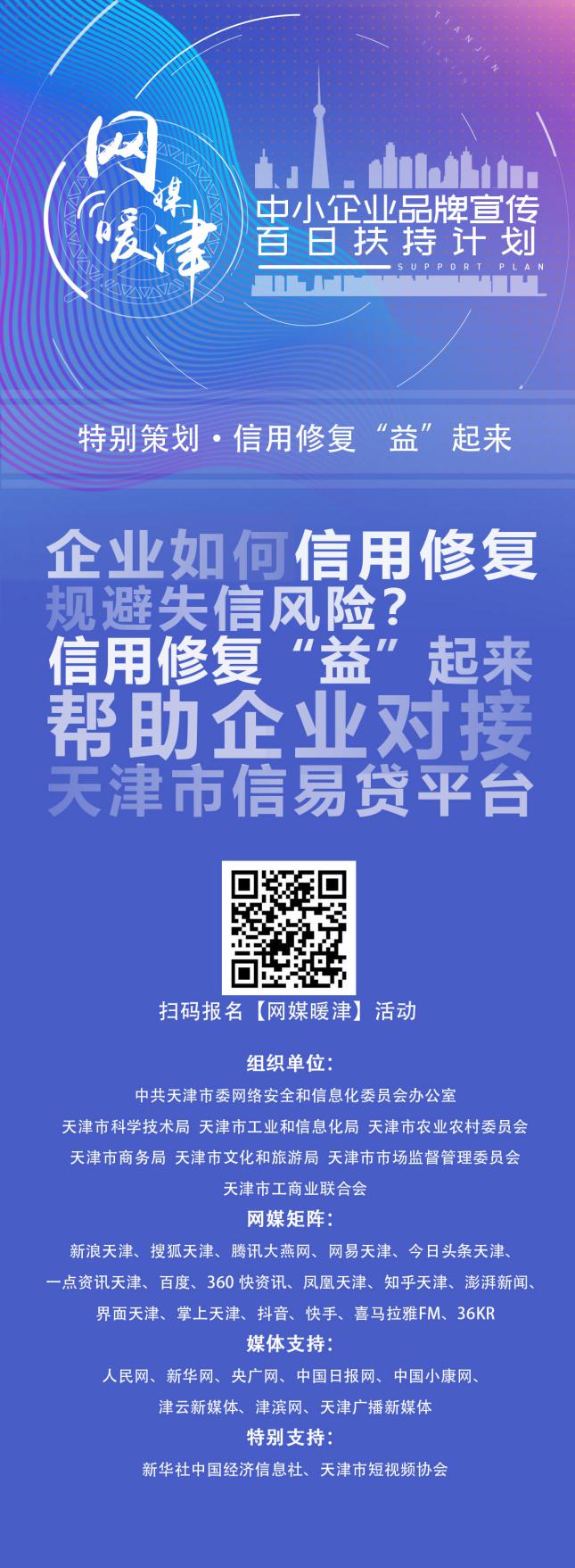 疫寒渐退,春暖津城。为了帮助众多中小企业尽快“回血”、过“疫”关,天津市委网信办、市科技局、市工业和信息化局、市农业农村委、市商务局、市文化和旅游局、市市场监管委、市工商联8部门从4月下旬起至8月初,联合开展“网媒暖津·中小企业 品牌宣传百日扶持计划”主题活动,全力扶持天津市中小企业复工复产、复商复市。活动期间将推出各种特色服务,包括为中小企业开展信用修复培训公益服务,向企业提供信用修复报告及培训证明,并免费帮助企业对接天津市中小企业融资综合信用服务平台(天津市信易贷平台)。