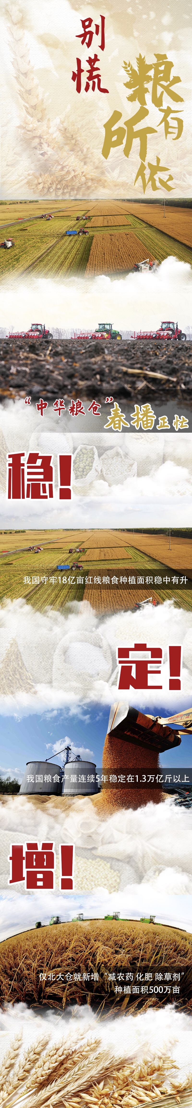 手里有粮,心里不慌。全民战“疫”,先稳饭碗。我国牢牢守住18亿亩耕地红线,粮食产量已连续5年稳定在1.3万亿斤以上,今年全国粮食种植意向面积稳中略增,保障粮食安全有底气。