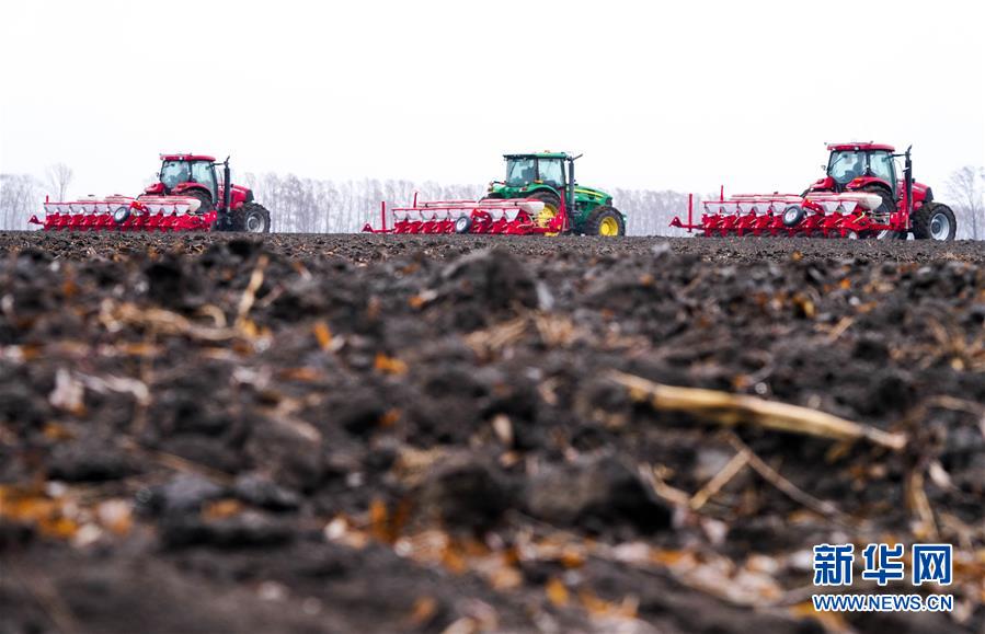4月27日,在北大荒农垦集团总公司五大连池农场有限公司第一管理区,拖拉机进行春播作业。新华社发(陆文祥摄)