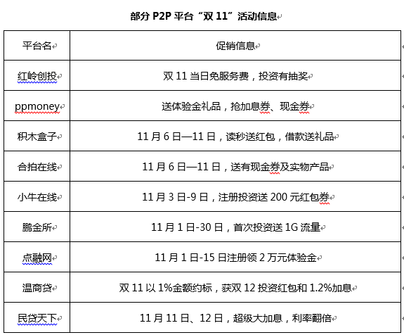 在P2P行业,不少平台在原有的促销活动基础上,还加上了新的“双11”噱头来吸客,单打独斗者有之,抱团取暖者也有之。