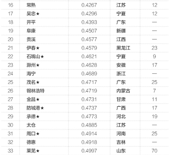 所以,我们会发现,因为县级城市的大量加入以及增加了暂住人口的计算,导致去年榜位靠前的拉萨、三亚、鄂尔多斯等城市位次在今年有所下降;而去年榜上的惠州、中山、义乌、宁波、合肥等城市因外来人口多,则直接排除了“鬼城”的可能性。