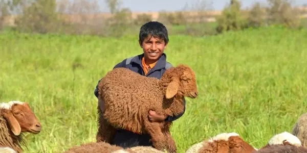 ▲有一次外出采访,在咱们营附近我拍摄了这张当地小孩放羊的照片,这小男孩特别开心,还特意把一只棕色的小羊羔抱在怀里让我给他照。
