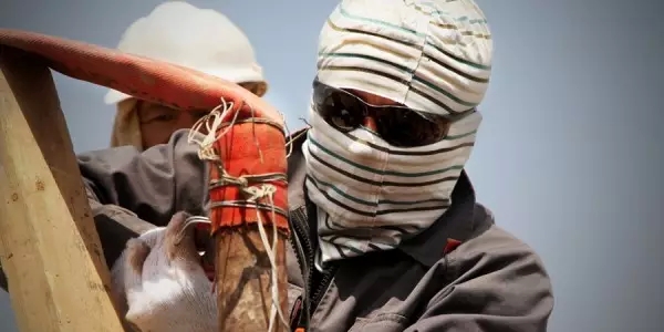 伊拉克四五月份,室外阴凉处的气温就已经达到四十八九度。那种高温不是热,是那种烫的感觉。大门的金属门把手不敢拿手直接碰触。有一个好事的同事,把一个鸡蛋磕到一块铁板上,没多久还真就变成了糖心荷包蛋。以往我们可能不能理解在中东地区的很多人会蒙面,穿长袍。来到这里之后,我们才明白,长袍能够阻隔炙热的高温,而面巾则可以有效地降低吸入空气的温度,和以前盖棉被卖冰棍的道理一样。我们员工们也都带面罩或在安全帽下围条湿毛巾。许多员工用废弃的T恤自制了只露出五官的面罩,尽管看上去有些滑稽。