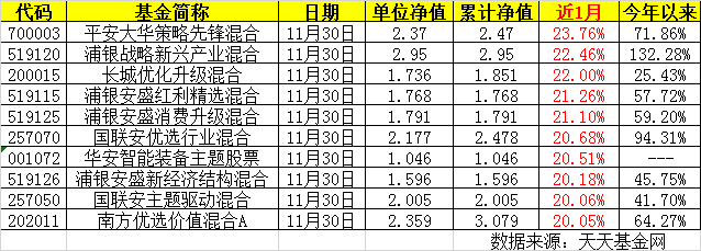 刚刚过去的11月,权益类基金进入冲刺阶段,业绩方面亦获得了全面丰收。90%的股票型基金、86%的混合型基金取得了正收益。下表为近1月收益前十名榜单,涨幅均在两成以上。最高的平安大华策略先锋混合(700003)涨幅达23.76%。