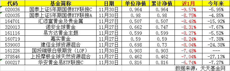 下面为负收益榜,近1月跌幅最大的是国泰上证5年期国债ETF联接C(020036)和国泰上证5年期国债ETF联接A(020035),界面新闻进一步查看净值发现,两只基金平时波动较小,但在11月9日单日出现巨跌,分别下跌9.59%和8.77%。另外,受大宗商品低迷影响,黄金和白银主题基金近1月表现不佳。尤其是首只白银主题投资基金—国投瑞银白银期货(161226)今年8月成立至今,长期处于发行价之下。