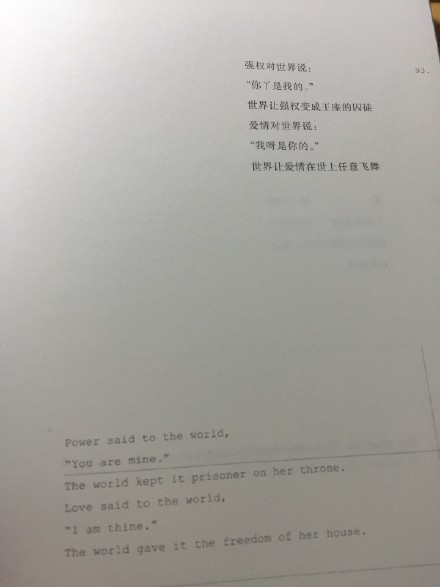 此外在翻译之余,冯唐还对诗歌理论提出了独到的见解。他在文章中表示“泰戈尔的英文翻译是不押韵的,郑振铎的汉语翻译是不押韵的,无论英文还是中文都更像剥到骨髓的散文。”而他本人则“固执地认为,诗应该押韵。诗不押韵,就像姑娘没头发一样别扭。不押韵的一流诗歌即使勉强算作诗,也不如押韵的二流诗歌。”所以,诗人冯唐做出了一个必将震惊世人的举措“我决定,我的译本尽全力押韵。”