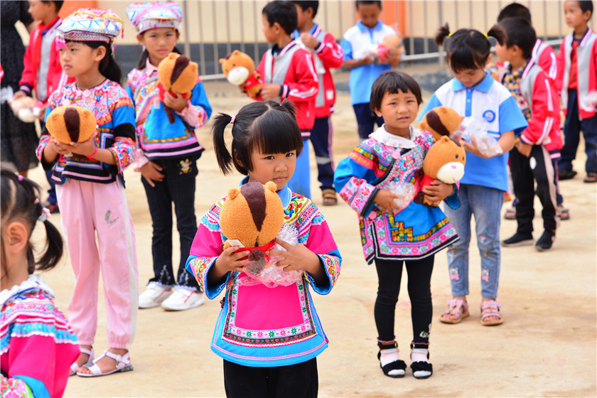 此次中骏云南己白小学公益行,就是为了当面把这份爱心满满的礼物交到孩子们手中。在现场,中骏公益星代表刘茵(设计管理部)、马翠(昆明公司)向59名学生送上小骏骏读诗机玩偶和蓝牙音响,其中录制的正是“诗暖童心”第一季成果【音乐诗词集】,通过传递这样温暖的诗音,不仅为了陪伴孩子们成长,也为了帮助这些彝族孩子更好地学习汉语文化。此外,中骏昆明公司员工们2019年到过己白小学后,对同学们渴望学习的精神深受触动,此次特意个人出资为学校采购了3台教学投影仪,由昆明公司行政人力总监黎琴为代表捐赠给校方,希望更好地助力孩子们学习。