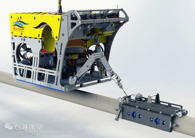 ROV可以携带水下测量设备调查海管铺设的位置、测量膨胀弯、掩埋海管、对接海管、后期海管检修等作业。海管铺设具体过程参见石油课堂008期文章:“能源管道”大解密——海底油气管道是怎样建成的?