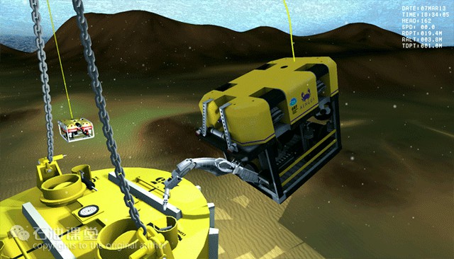 ROV的水面控制系统位于船上,工作人员通过大屏幕可以看到ROV所处环境,操作机械手进行相应的作业。