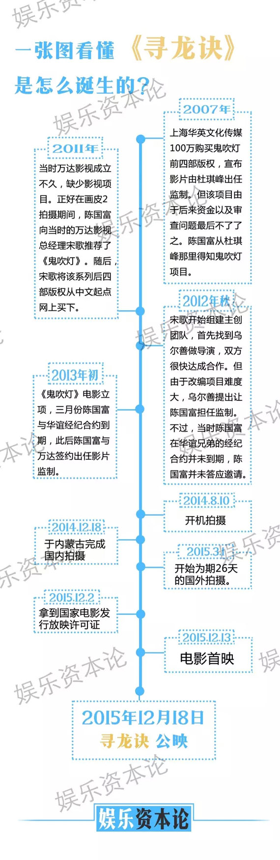 这还要从万达影视说起。2012年,万达影视刚刚成立不久,也仅仅是投资了《HOLD住爱》之类的影片,缺少能打品牌的大型影视项目,时任总经理的宋歌找到陈国富,陈国富向他推荐了《鬼吹灯》。在上海华英文化传媒买到《鬼吹灯》前四部版权的情况下,宋歌立即从中文起点网上买下《鬼吹灯》后四部版权。自此,《鬼吹灯》才成为万达旗下的项目。这也奠定了万达影视在之后的整个《寻龙诀》项目中主投主控的地位。