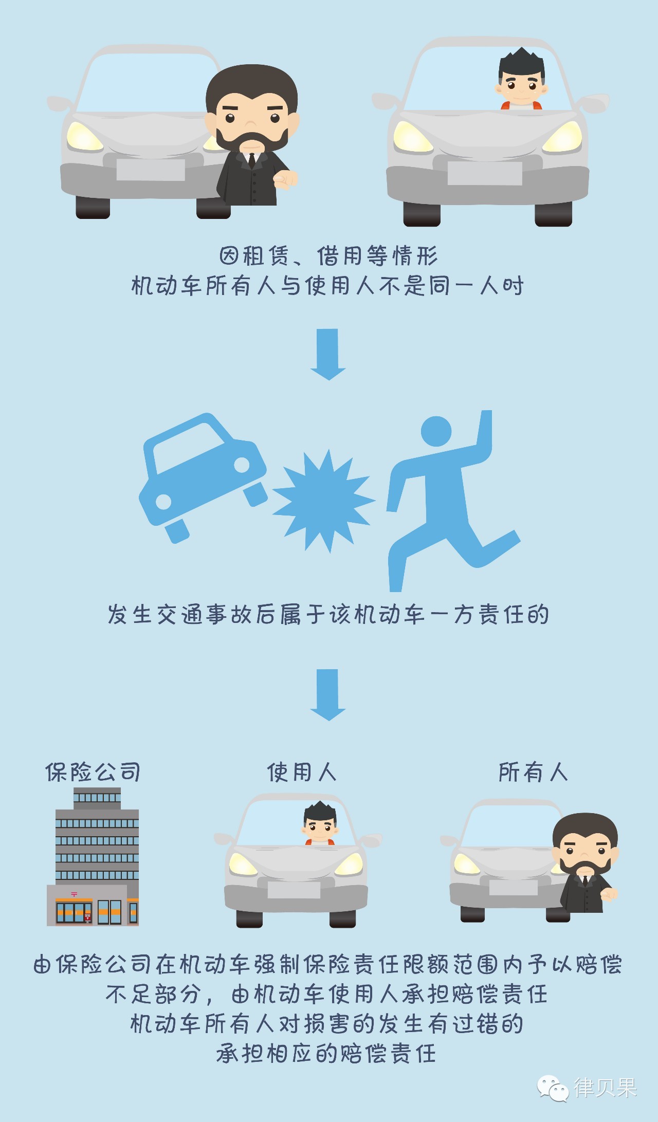 《侵权责任法》第四十九条规定:“因租赁、借用等情形机动车所有人与使用人不是同一人时,发生交通事故后属于该机动车一方责任的,由保险公司在机动车强制保险责任限额范围内予以赔偿。不足部分,由机动车使用人承担赔偿责任; 机动车所有人对损害的发生有过错的,承担相应的赔偿责任。”