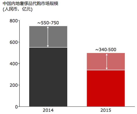上一年的消费者调查显示,70%的中国内地受访者曾通过代购渠道买入奢侈品,他们所贡献的销售额(550 亿-750 亿)相当于中国内地门店的 50%。到了 2015 年,情况突然生变,代购的市场规模缩小至 340 亿-550 亿元。