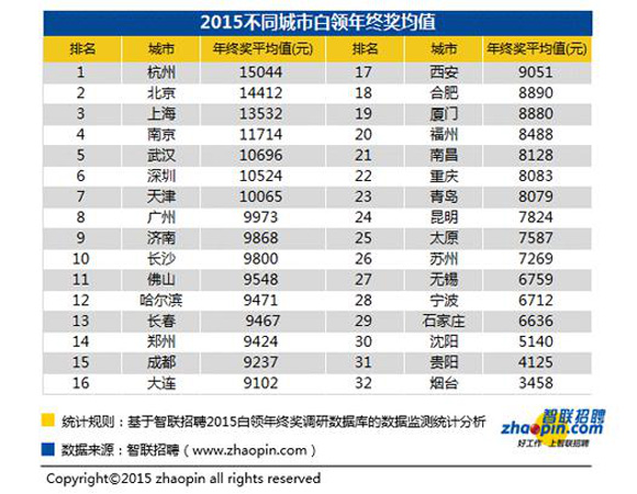 从地域来看,在这次调查的32个主要城市中,杭州白领年终奖均值超过1.5万元,领跑全国。其次是北京白领,年终奖均值约为1.44万元,上海白领以约1.35万元的年终奖均值排名第三。贵阳和烟台白领年终奖不足5000元,排名最末。