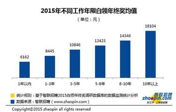 一般来说,工龄越高的白领,其所得年终奖也越高。“我们公司年会上设置有10年服务年限奖,年底时会给服务超过10年的员工发一笔奖金。”埃森哲咨询顾问辛忻告诉界面新闻记者。据智联招聘调查,10年以上工作年限的白领年终奖平均值为1.8万元;1年以内工作年限的白领年终奖均值为6000元,工作年限每上升一个阶段,年终奖都有2000元左右幅度的提升。