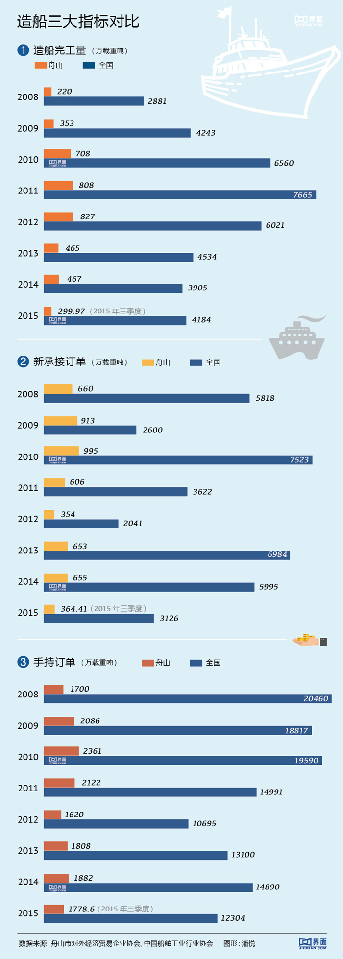 舟山素有“开门见海、出门坐船”一说,千余座岛礁围绕着本岛,孕育着当地造船业的繁荣。在舟山的工业总产值中,造船业占据着半壁江山,全国造船业超过1/10的市场份额,也由这座岛城所占据。以2014年为例,完工量、新接订单量以及手持订单量这三大造船指标,舟山的份额均占到全国总量的12%以上。