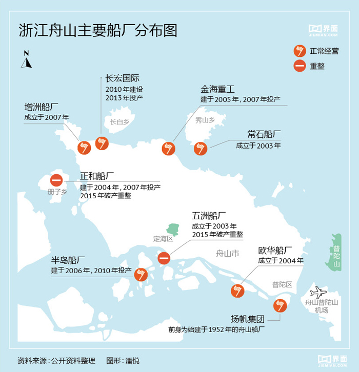 这两家船厂有着颇为类似的命运轨迹,它们均是在2005年前后开始涉足造船行业。五洲船厂的主要业务原本是修船,当时形势一片大好的造船业让企业决定谋划转行,并在岛上修建起了现在的造船基地。