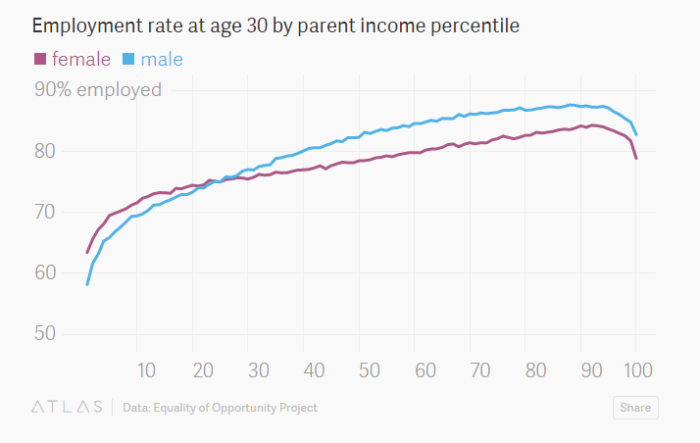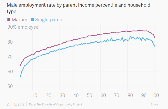 孩子的父母是否在一起也同样会对他们今后的就业率产生影响:不论是哪个收入水平,比起来自完整家庭的男孩,出生于单亲家庭的男孩30岁前的就业率都要更低。