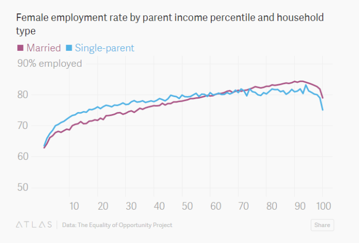 研究人们发现,成长于单亲家庭的女孩30岁前的就业率反而会略微好一些。而在更高收入水平的群体,健全家庭成长的女孩的就业率则会更佳。