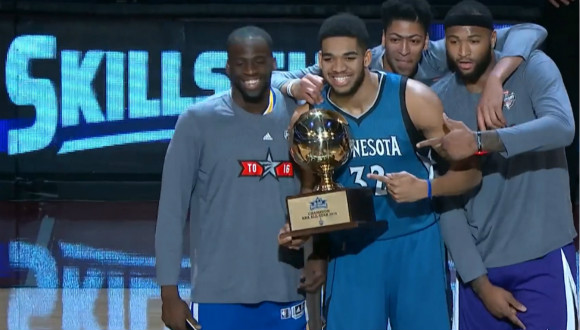 大个子和小个子的技巧挑战赛决赛,本应是毫无悬念的对决。然而,“状元”唐斯却在决赛中拿出了惊人的表现,尽管运球过人环节稍稍落后,但唐斯在传球入筐和上篮两个环节都一气呵成,弥补了弱势。最终的三分环节,其他三位参赛内线球员全部站在了唐斯身后准备为其庆祝。两人的前两个三分均投失,最终唐斯第三球投中,赢得了技巧挑战赛的冠军。